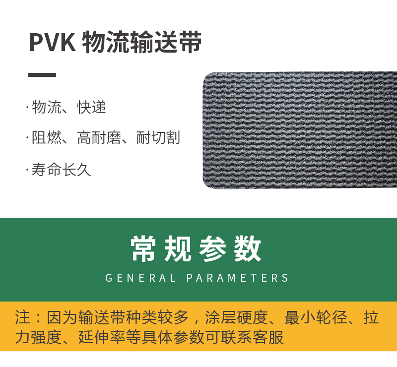 • PVK输送带 具有阻燃的特性,同时也拥有很高的耐磨性和耐切割性,使用寿命较长,适用于物流、机场、快递、邮政等长距离输送行业。